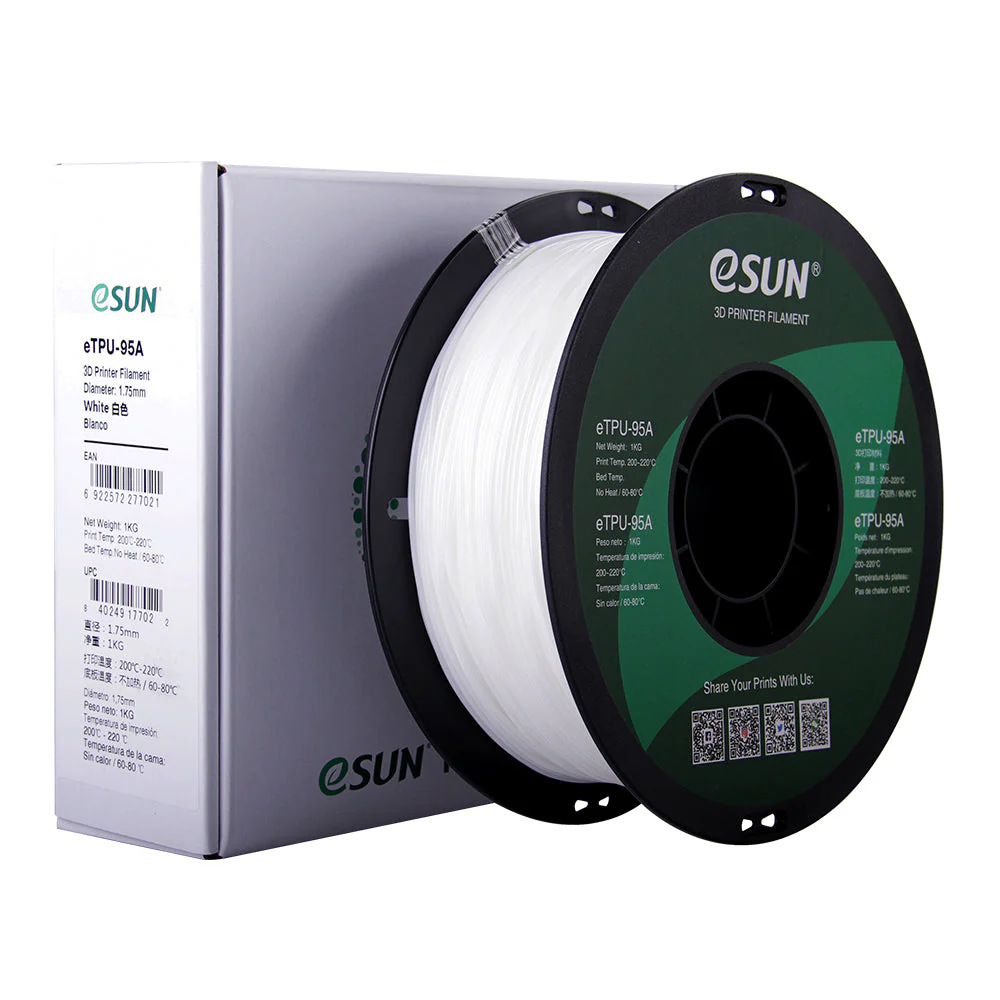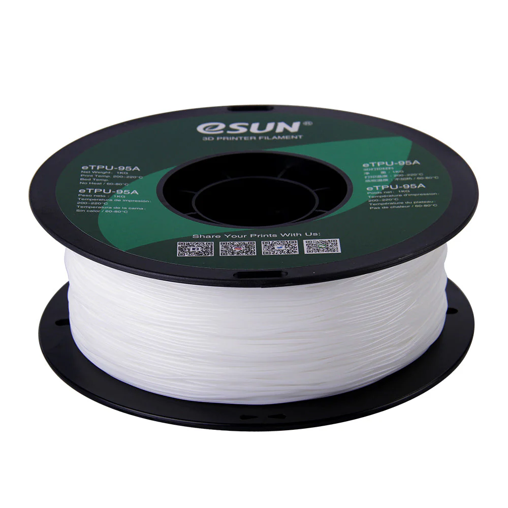 Das eSun eTPU-95A ist ein hochwertiges, sehr flexibles TPU-Filament mit einer Shore-Härte von 95A. Es eignet sich ideal für Bauteile, die dauerhaft elastisch bleiben sollen und nach Belastung zuverlässig in ihre ursprüngliche Form zurückkehren. Dank seiner hohen Reissfestigkeit, Schlagzähigkeit und Abriebfestigkeit ist es besonders langlebig und vielseitig einsetzbar. Das Material ist hydrophob, nimmt kaum Feuchtigkeit auf und zeigt eine gute Beständigkeit gegenüber UV-Strahlung, Ölen und tiefen Temperaturen. Dadurch lassen sich auch funktionale Teile für den Aussenbereich problemlos herstellen. Die gute Fliessfähigkeit ermöglicht saubere Druckergebnisse und – je nach Drucker – auch höhere Druckgeschwindigkeiten.